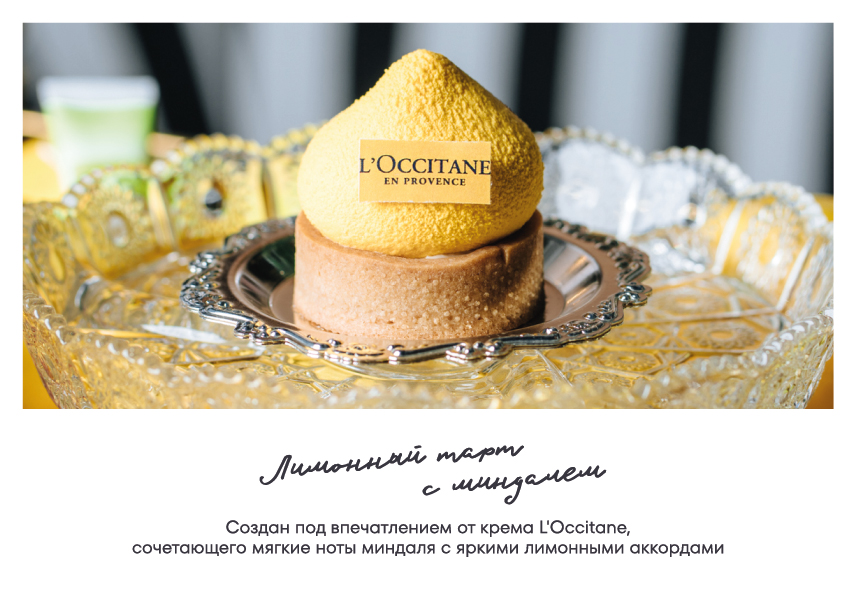 История ароматов продолжилась в десерте. Андрей Мокин создал лимонный тарт с миндалём, вдохновившись кремом L’Occitane, в котором сочетаются мягкие миндальные ноты и яркие лимонные аккорды.